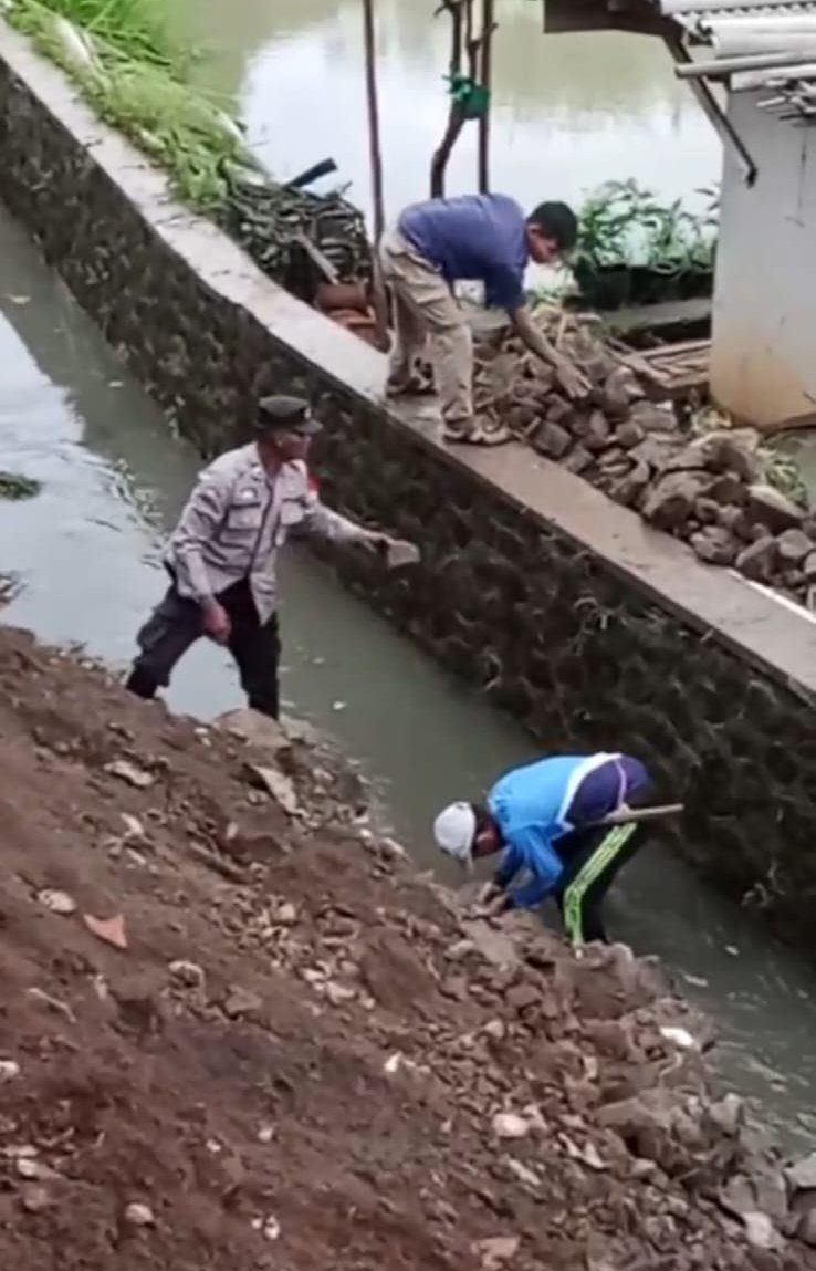 Polsek Malangbong bersama warga bahu membahu memberisihkan bekas material tanah longsor dan akhirnya material tanah longsor dapat dibersihkan serta saluran air berfungsi normal kembali.
