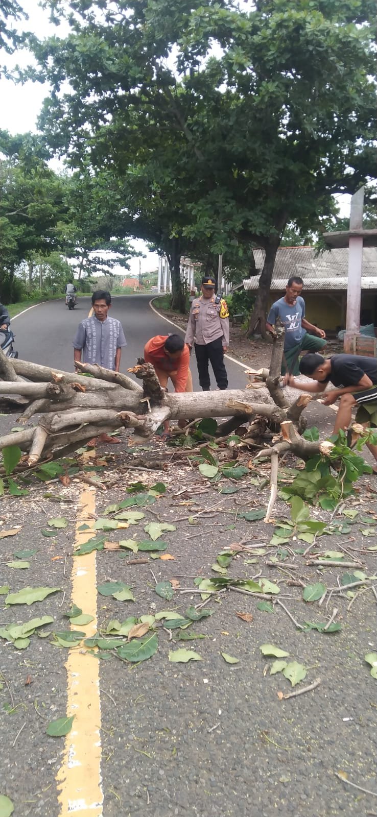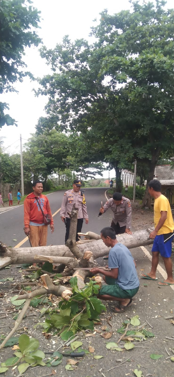 Bersama dengan warga sekitar Kapolsek Cikelet dan anggota memotong pohon tumbang tersebut menggunakan Sinso dan Golok.
