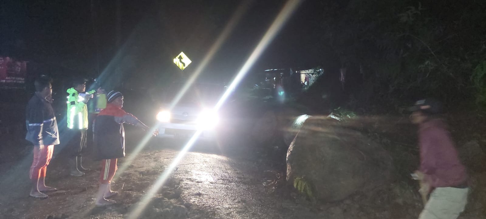 Selain itu tumpahan material longsor berupa batuan besar mengakibatkan tertutupnya sebagian badan Jalan penghubung Cikajang – Pameungpeuk (Kampung Batu tumpang). Polsek Banjarwangi bekerja sama dengan FKPM Polsek Banjarwangi, tim PUPR, aparatur Desa Tanjungjaya dan masyarakat sekitar untuk membersihkan material longsor.