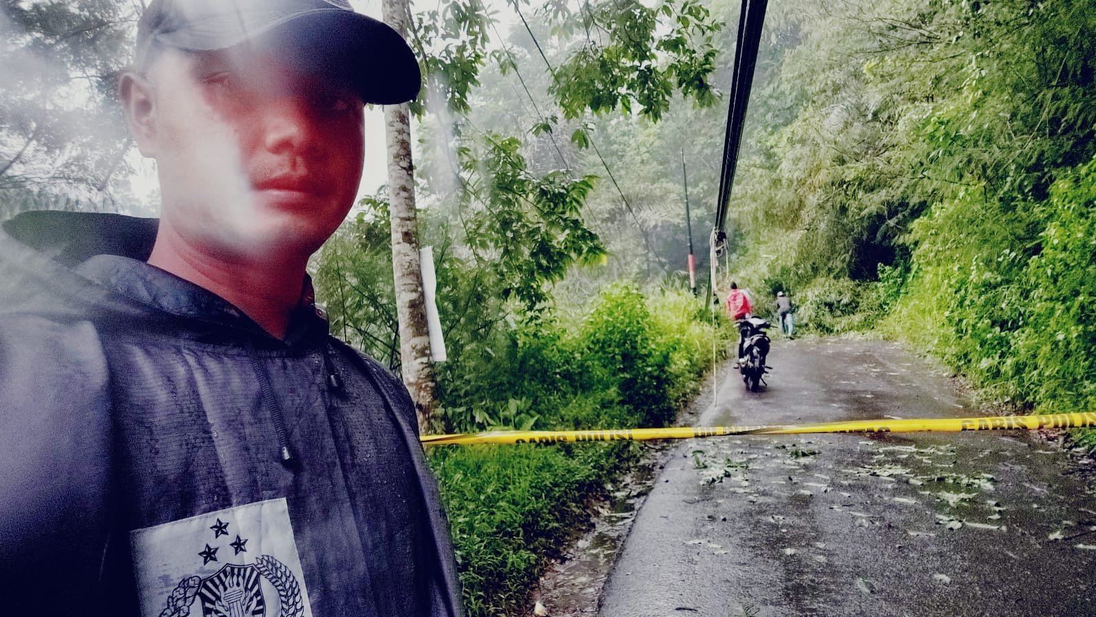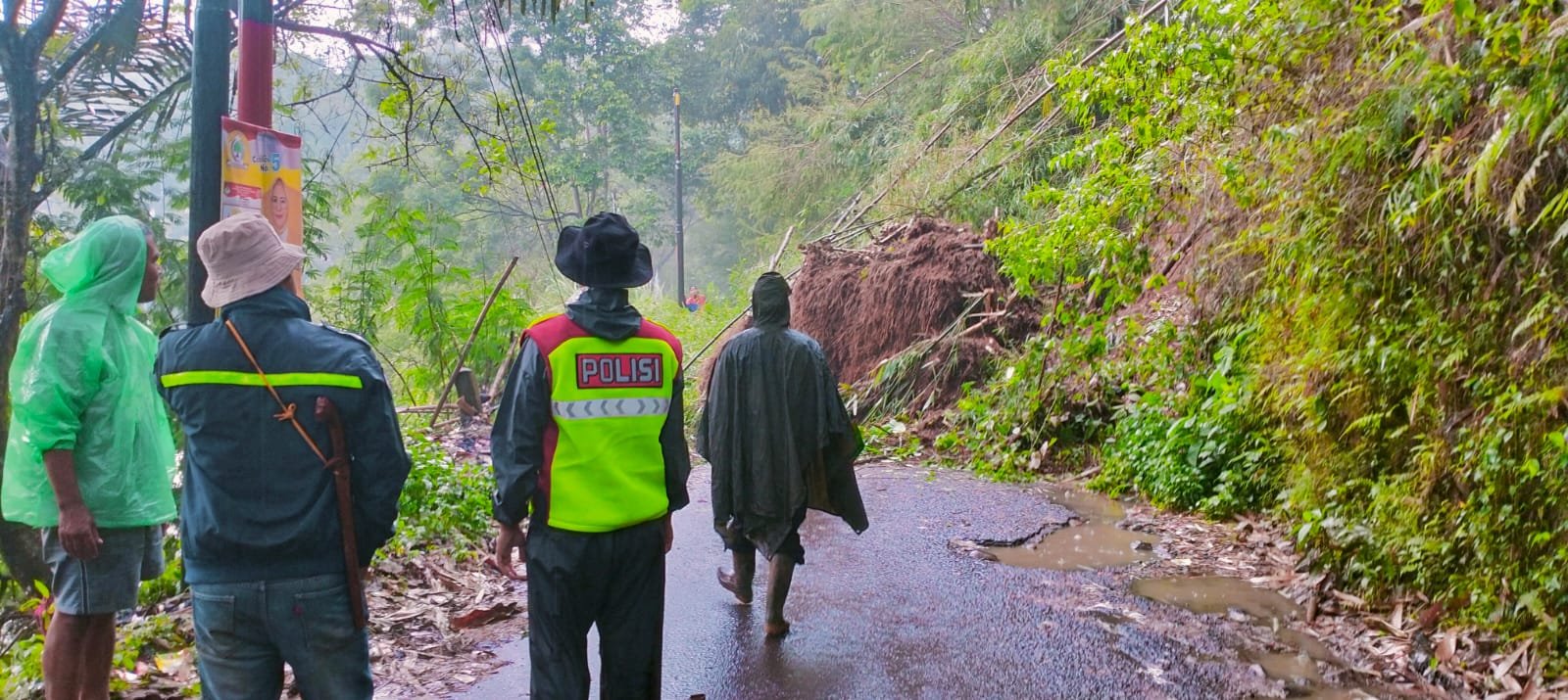 Material longsor berupa tanah dan pohon menutup badan jalan sepanjang 10 m dan tinggi 15 m terjadi karena intensitas hujan yang cukup tinggi dan lama.