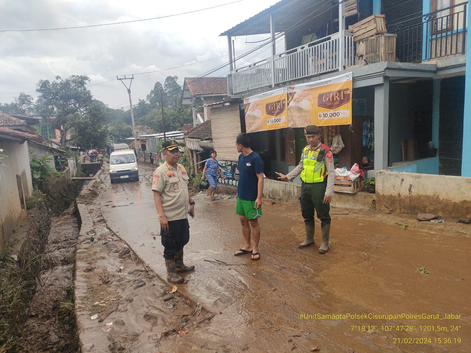 LOCUSONLINE.CO – Polsek Cisurupan Polres Garut cek lokasi kejadian bencana alam meluapnya air dan lumpur ke Jalan Desa di Kampung Cibojong Desa Balewangi Kecamatan Cisurupan Kabupaten Garut. Rabu siang (21/02/2024).