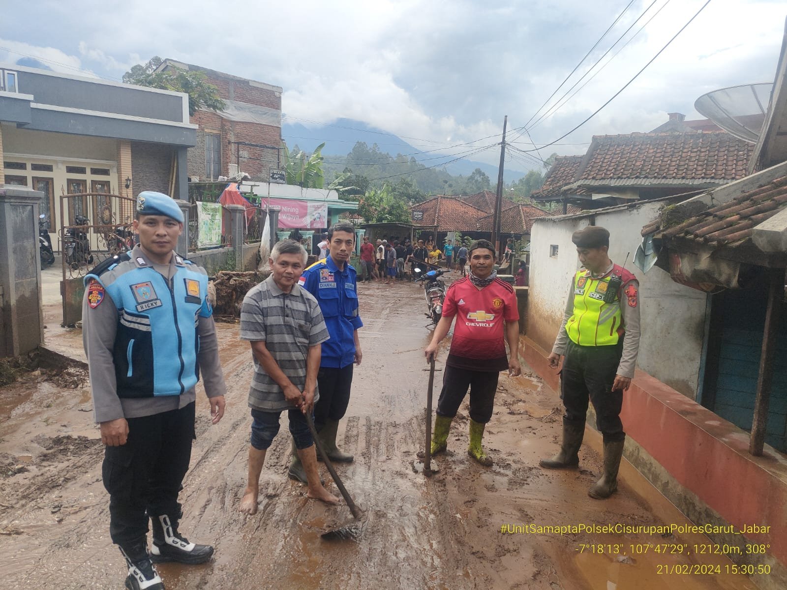 Kemudian anggota Polsek Cisurupan, Satpol PP Kec. Cisurupan bersama-sama dengan warga membersihkan material sumbatan berupa lumpur atau tanah yang berada di Jalan Desa itu agar bisa kembali digunakan oleh warga sekitar.