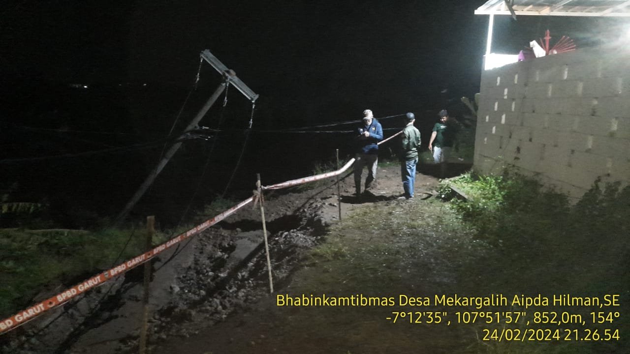 Anggota Bhabinkamtibmas Polsek Tarogong Kidul Aipda Hilman diterjunkan ke lokasi bencana yang turut didampingi oleh Babinsa Koramil Tarogong, Kepala Desa Mekargalih dan Ketua BPD Desa Mekargalih.