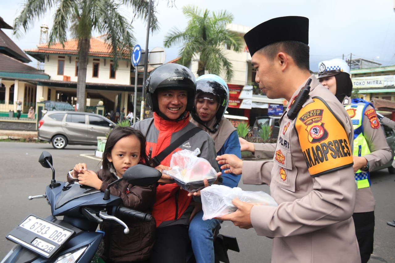 Selain membagikan makanan petugas juga memberikan himbauan tertib ber lalu lintas. Hal ini di lakukan dalam rangka persiapan Operasi Keselamatan Lodaya 2024 yang akan berlangsung dari tanggal 4 sampai dengan 17 maret 2024.