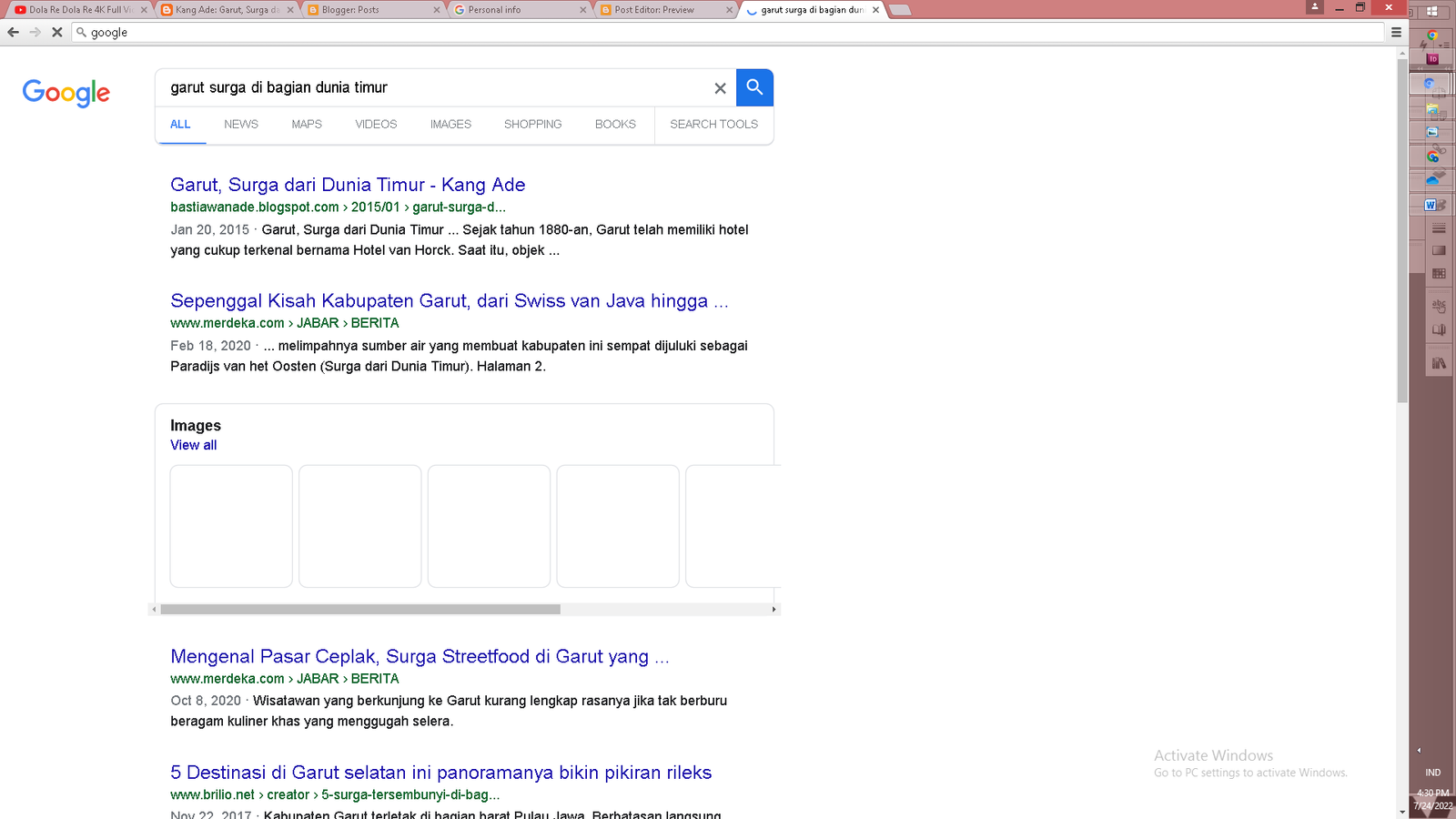 Kemudian penulis kembali melakukan pencarian di Google. Kali ini, kata kuncinya diganti menggunakan bahasa Indonesia. Pencarian kata yang ditulis penulis adalah Garut surga di bagian timur. Setelah menggunakan kata-kata ini, baru muncul sejumlah artikel yang membahas Garut adalah surga di bagian dunia timur.