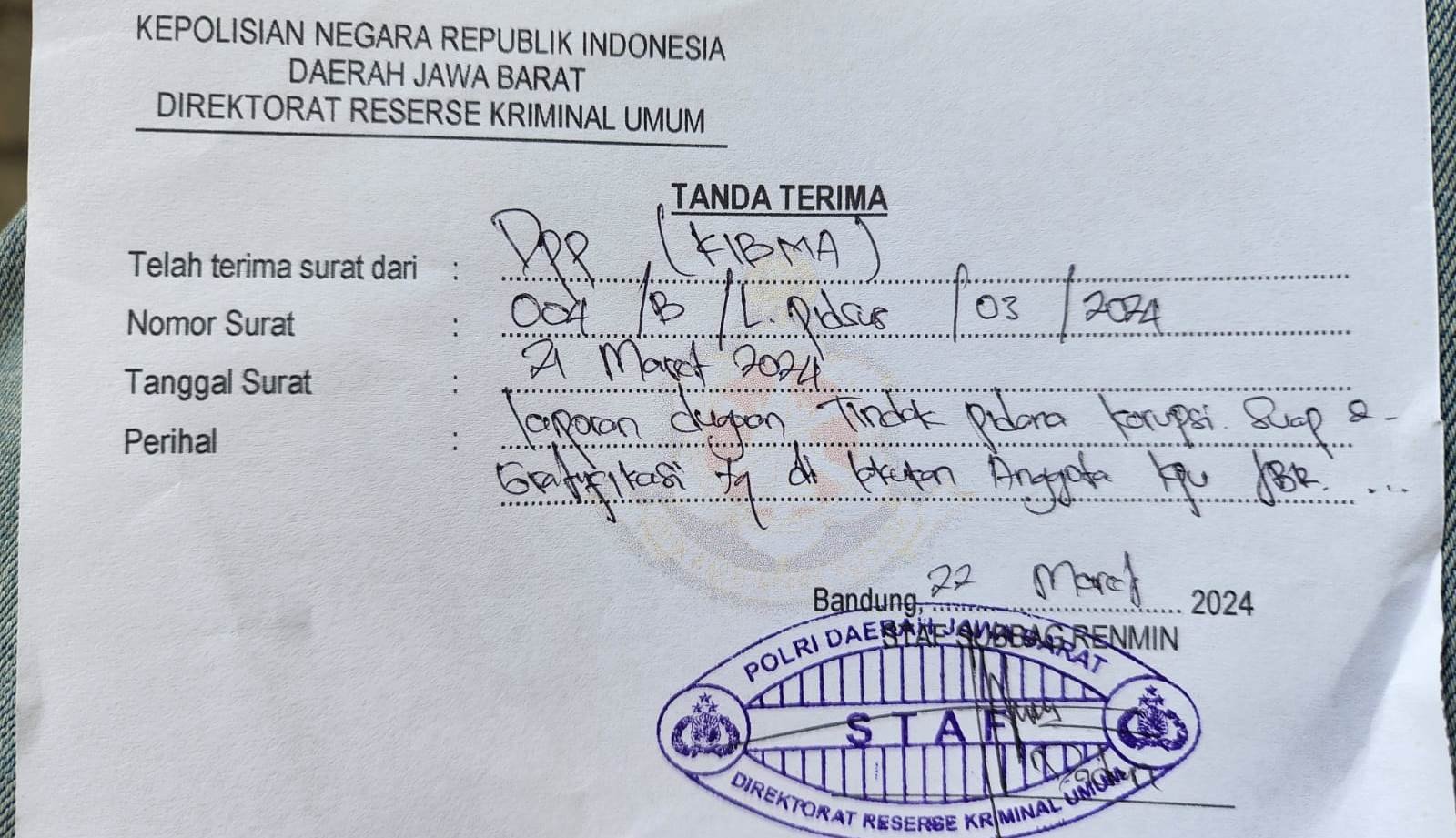 “Kami melaporkan kedua oknum penyelenggara negara dengan inisial AN dan DH ke Polda Jabar dengan dugaan gratifikasi,” ujar Ketua DPP Kibma Jawa Barat, Ir. H. Ahmad Sutisna, Jumat (22/03/2024).